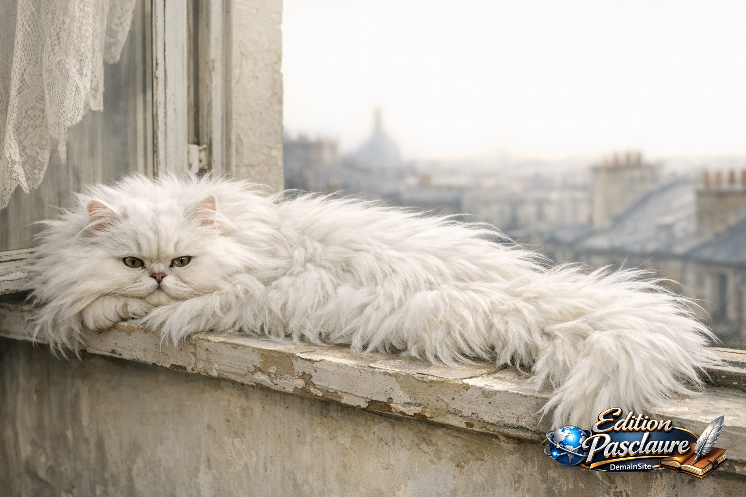 Le chat persan, jeté comme une écharpe de marabout sur le bord de ma fenêtre.